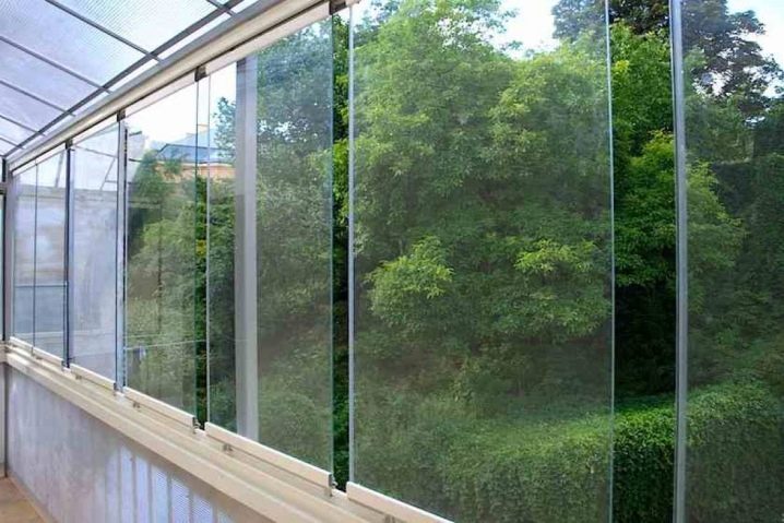 ستفتح الأبواب بطريقة منزلقة. يتيح هذا التصميم نقل الوشاح إلى جانب واحد ، مما يؤدي إلى تحرير مساحة الشرفة بأكملها. تجعل الطريقة بدون إطار من الممكن تحقيق الزجاج البانورامي ، والذي يعطي مظهرًا فعالاً للغاية. هذا الخيار أيضا له عيوب. السبب الرئيسي هو أن موقع التثبيت يجب أن يكون له سطح مستوٍ تمامًا مع خط أفقي واضح..