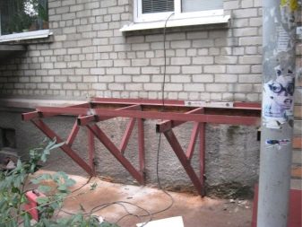 على أي حال ، يجب أن يبدأ البناء بإنشاء الأعمدة ، كما هو موضح أعلاه ، أو بلحام المنحدرات ، والتي يجب تثبيتها من الحافة الخارجية لمنصة الركيزة إلى جدار المنزل. علاوة على ذلك ، وبغض النظر عن طريقة الدعم التي يتم اختيارها ، فمن الضروري تثبيت عوارض الدعامة. على عكس الشرفة المبنية على أساس ، يتم هنا إحضار العوارض مباشرة إلى الغرفة نفسها ، مما يسمح بتثبيتها وتقويتها بشكل آمن.
