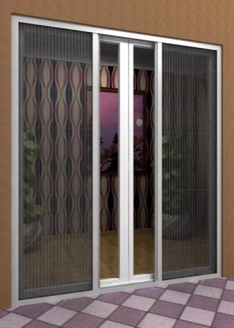عند الفتح ، يرتفع هذا الهيكل أولاً ، ثم ينتقل إلى الجانب. اتضح أن وشاحًا واحدًا متراكبًا على الثاني. أفضل استخدام لهذا النوع من الهيكل المنزلق للتثبيت على لوجيا ذات مداخل واسعة..