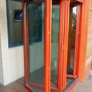 يحتوي هذا التصميم على العديد من اللوحات ، والتي ، عند فتحها ، تطوى إلى أكورديون ، أي أن كل جزء ، عند فتحه ، يتكشف بشكل عمودي على الحائط ، ويتحرك التجميع الناتج بالكامل في اتجاه واحد. هذه الأبواب لا تتداخل ولا تخفي واحدة تلو الأخرى. يشغل هذا النوع من الأبواب المنزلقة مساحة أكبر بقليل من الأبواب السابقة وهو أيضًا أكثر ملاءمة للمداخل الواسعة. عيب آخر لهذا التصميم هو أن ملفات تعريف جميع الوشاح مفصولة ، وفي نفس الوقت لا تسمح لضوء النهار بالتغلغل. غالبًا ما تكون هذه الأبواب مصنوعة من البلاستيك ، وفي كثير من الأحيان يمكنك العثور على أبواب خشبية وألومنيوم بتصميم يشبه الأكورديون..