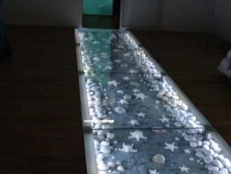 الفسيفساء وأحواض السمك والرسومات فقط مدمجة في مثل هذه الأرضيات ، أو يمكنك حتى ترك طبقة شفافة تمامًا. على الرغم من جمالها ومتانتها ، لا تزال الأرضيات الزجاجية غير مصممة كغطاء لهياكل التدفئة. على الرغم من أنه ، كعنصر مستقل ، فهو مناسب تمامًا ، حيث عادةً ما تلعب الطبقة الثانية من الوحدة الزجاجية دور العزل.