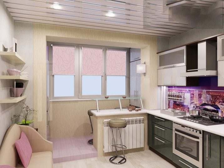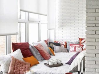 يمكنك زيادة المساحة من خلال دمج لوجيا الخاص بك مع غرفة أخرى ، مثل الصالة أو المطبخ. سيكون من الممكن وضع أريكة صغيرة وثلاجة وخزانة على الشرفة. قم بتزيين المساحة وفقًا لمفهوم أسلوب الشقة. ستكون الفكرة الجيدة هي وضع فسيفساء متعددة الألوان على أرضية لوجيا. سيؤدي ذلك إلى توسيع المساحة بصريًا ، بالإضافة إلى إضافة المزيد من الضوء والإيجابية..