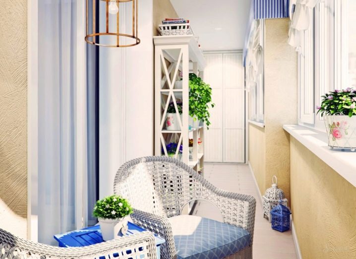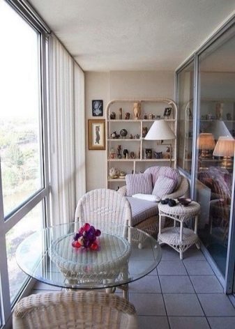 يمكنك وضع كراسي من الخيزران وطاولة على لوجيا. هناك يمكنك الاجتماع بشكل مريح مع الأصدقاء ومناقشة آخر الأخبار وقضاء الوقت في جو ودي. استكمل الشرفة بعنصر من الزجاج الملون ، ضع الزهور المفضلة لديك على طاولة زجاجية صغيرة وستشعر بالانسجام والإيجابية طوال الوقت عندما تريد الخروج في الهواء الطلق.