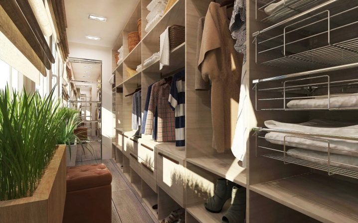 تعتبر خزانة الملابس على الشرفة خيارًا رائعًا لشقة استوديو. يمكنك الآن تخزين متعلقاتك بسهولة وراحة في مكان معين. يمكنك تزيين المساحة بالطراز المختار ، حيث توجد عناصر تعكس صدى الغرفة الرئيسية ، على سبيل المثال ، مع القاعة. هذا الخيار مناسب لغرفة دائرية نصف دائرية ومربعة.