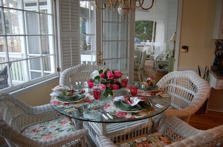 هل تحب الدوافع الفرنسية؟ ثم هذا النمط لك. إنه مناسب لأي مساحة: لغرفة مثلثة أو غير زجاجية ، إلخ. يمكنك وضع طاولة ، كراسي بذراعين / كراسي أو أريكة. إذا كان لديك فتحة متصلة بقاعة ، على سبيل المثال ، فإن الأمر يستحق الاستمرار في مفهوم النمط في غرفة أخرى. يتضمن هذا النمط استخدام ظلال الباستيل: البيج والأخضر والخزامى والبحر والبرتقالي.