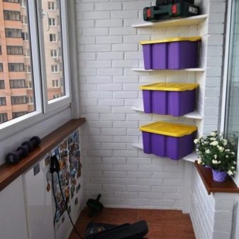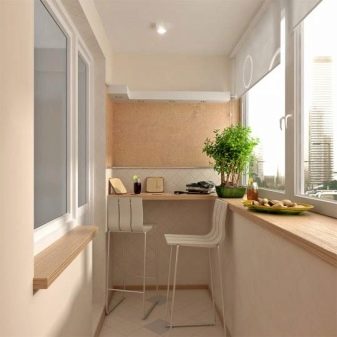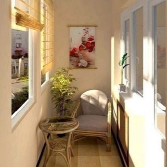 بالنسبة لهذه الشرفات ، من المتوقع استخدام أنظمة النوافذ المنزلقة. وبالتالي ، يمكنك توفير المساحة بشكل فعال. من المفيد أيضًا استخدام الزوايا بعقلانية. في نهاية الشرفة ، يمكنك عمل خزائن مدمجة. يمكن تخزين جميع الأدوات المنزلية والإكسسوارات بشكل مريح هناك. ينصح المصممون أيضًا باستخدام الألوان الفاتحة عند تزيين الغرفة من أجل توسيع المساحة المرئية..