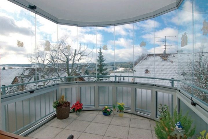 الشرفات ذات الزجاج البانورامي هي تصميمات جميلة للغاية تسمح لك بزيادة التدفق الضوئي إلى المنزل. في فصل الشتاء ، يكون تشغيل هذه الأنظمة أمرًا صعبًا ، حيث يمكن أن يؤدي دخول الرطوبة إلى تجميد الستائر. غالبًا ما يستخدم هذا التزجيج كعنصر زخرفي. يعتبر الزجاج بدون إطار فرصة فريدة لتنظيم حديقة صيفية على الشرفة وتحويل الغرفة إلى مناطق استوائية صغيرة.
