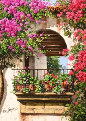 - شرفة كبيرة مشرقة ، مزينة بسخاء بالنباتات الطموحة بظلال وردية.
