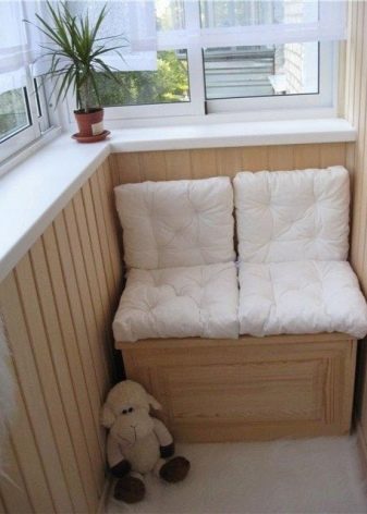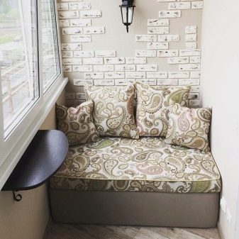 إذا كنت ترغب في توفير الراحة لغرفة لوجيا الخاصة بك أو تجهيز منطقة استرخاء هناك ، فإن أثاث الشرفة الناعم هو بالضبط ما تحتاجه. تعتبر لوجيا المعزولة مثالية لتركيب العناصر الداخلية الناعمة. هذا الأثاث مناسب بشكل خاص للشرفات التي يتم دمجها مع المطبخ أو غرفة المعيشة ، ولا يتم فصلها عن هذه الغرف إلا بواسطة قسم. يمكنك تركيب سرير قابل للطي ، وأريكة صغيرة مع صندوق تخزين للمرتبة أو بياضات السرير. تعتبر الأرائك المدمجة مع مكان للنوم مثالية ، أو يمكنك وضع طاولة بها عثماني ناعم هناك..