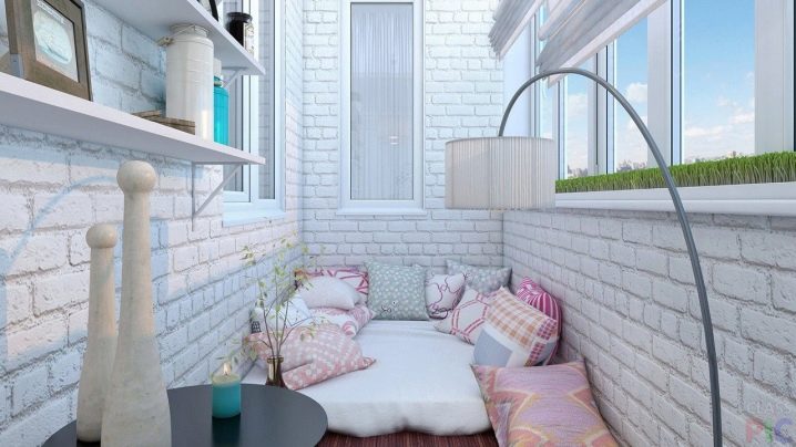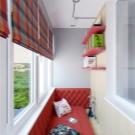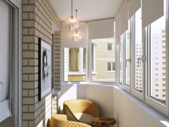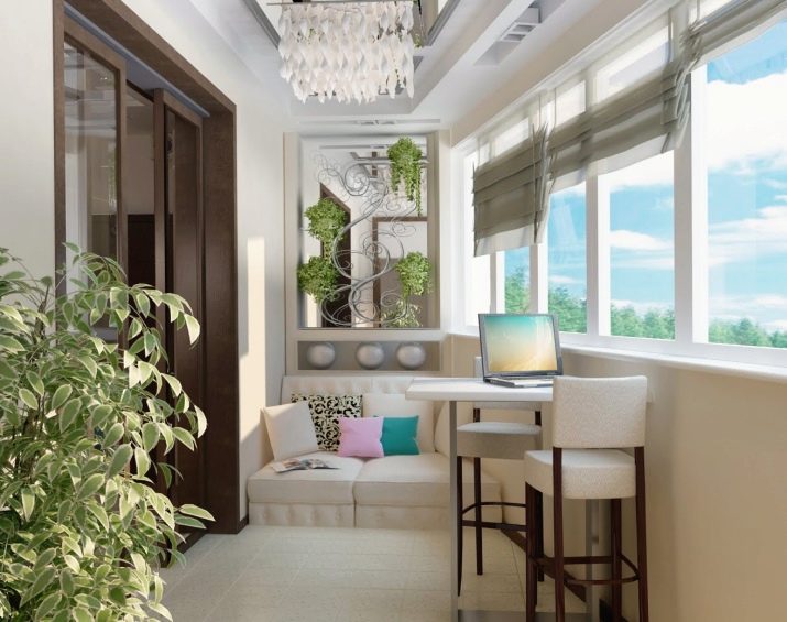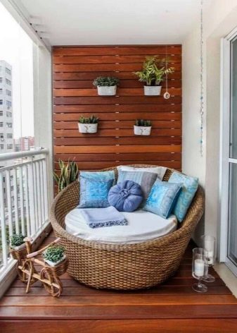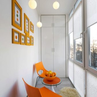 تعتمد الزخرفة الداخلية للشرفة ، أولاً وقبل كل شيء ، على حجمها. هناك العديد من أنواع الديكورات الداخلية التي تعتبر رائعة لتزيين هذه المساحة. بالنسبة للمقطع الصغير ، من الأفضل اختيار أثاث الزاوية الحديث بألوان دافئة. بهذه الطريقة يمكنك إنشاء ركن مريح. مثال على هذا التصميم هو خزانة ملابس زاوية صغيرة وأريكة زاوية مع طاولة صغيرة وعثمانيين.