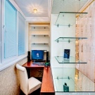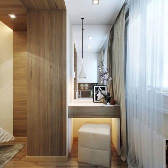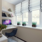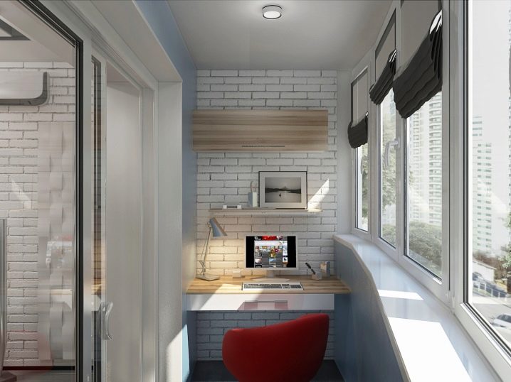 أصبح من الشائع الآن تجهيز منطقة عمل على الشرفة ، لأنه في هذه الحالة يتحول مكتب خاص في الهواء الطلق مع الضوء الطبيعي. لمثل هذا التخطيط لوجيا ، من الأفضل شراء طاولة كمبيوتر صغيرة من نوع الزاوية مع أدراج. للراحة ، يمكنك تثبيت عدة أرفف كتب مفصلية فوقه. يعد كرسي الكمبيوتر المدمج واثنين من الخزانات ذات الأبواب مثالية أيضًا لمكان العمل هذا. الأبواب ضرورية حتى لا تكون محتويات الخزانة مغبرة.