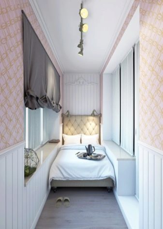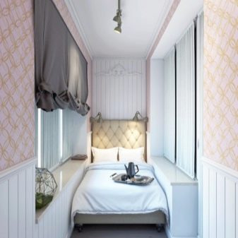 غرفة النوم على الشرفة ستسعد أيضًا عشاق بساطتها. في مساحة صغيرة ، يمكنك فقط تثبيت كل ما تحتاجه ، مما يعني أنه يمكنك الاستغناء عن كل التفاصيل غير الضرورية. والترتيب في مثل هذه الغرفة الصغيرة أسهل بكثير..