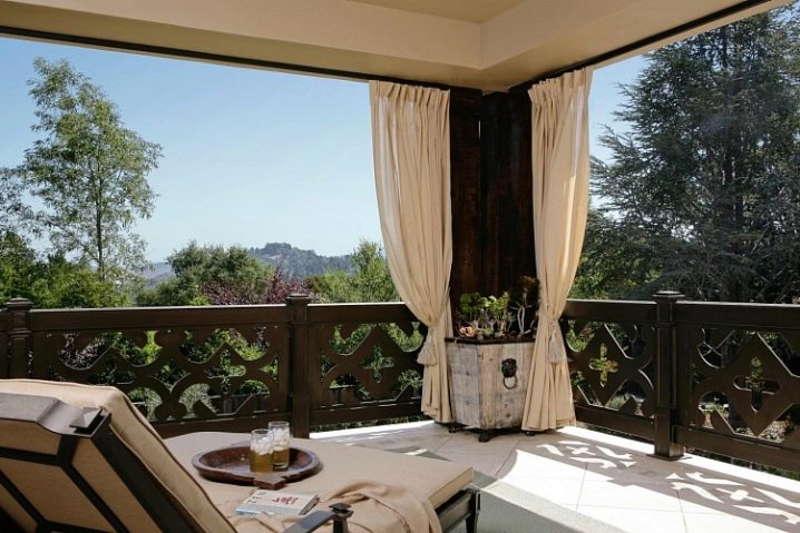ستصبح الستائر على الشرفة المفتوحة مناسبة أيضًا: اختر الستائر الكلاسيكية واربطها على وجهين متقابلين من لوجيا. ستكون هذه الستائر مناسبة وعملية في المواسم الدافئة والجافة ، خاصة في منطقة المنتجع ، فهي ستحمي من أشعة الشمس وتعطي الشرفة طرازًا أصليًا..