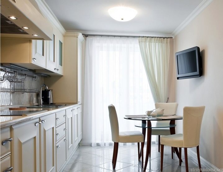 - يجب ألا تتداخل ستائر المطبخ مع باب الشرفة مع الفتح الحر للباب ، اختر ستائر غير صلبة ، ولكن من جزأين لتوفير الوصول المجاني إلى الشرفة وليس لفترة طويلة.