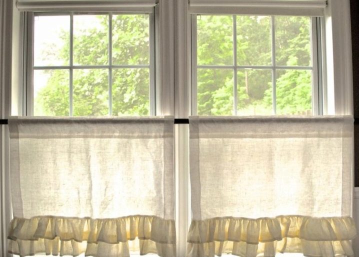 الستائر الشفافة الخفيفة مناسبة تمامًا للمطبخ المتواضع ، وتسمح لك الحبال الموجودة على الستائر بتثبيتها في الموضع المطلوب وإتاحة الخروج إلى الشرفة مجانًا..