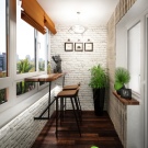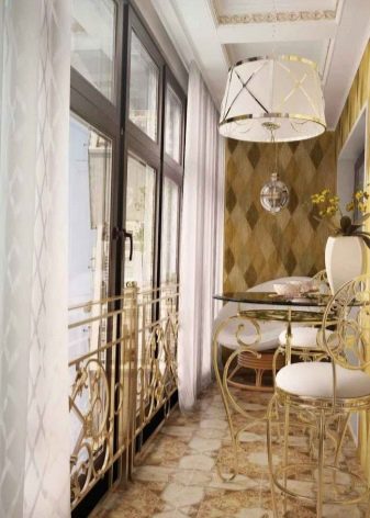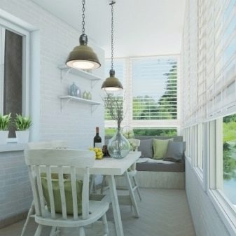 لوجيا شرفة مع نوافذ فرنسية ، حتى الستائر القصيرة المثبتة من الأسفل في منطقة المقاعد – الأرائك أو الكراسي بذراعين مناسبة.