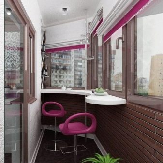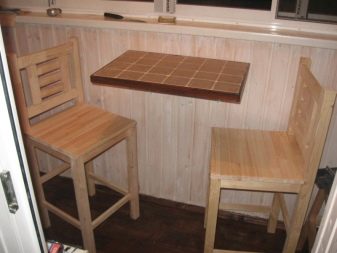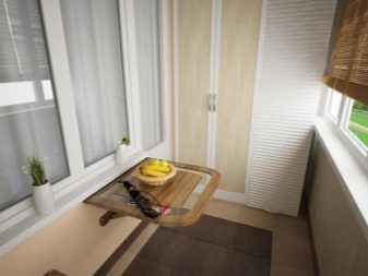 يتم إرفاق طاولة قابلة للطي ذات شكل دائري أو مربع بعناصر قوية ؛ يمكنك تنويع الطاولة باستخدام أرفف مفصلية ، والتي ستصبح مكانًا إضافيًا للتخزين أو الديكور. اجعل الشرفة أكثر راحة – ضع كراسي خشبية قابلة للطي أو ناعمة لا تزيد عن 2-3 قطع في مساحة صغيرة حتى لا تفسدها.