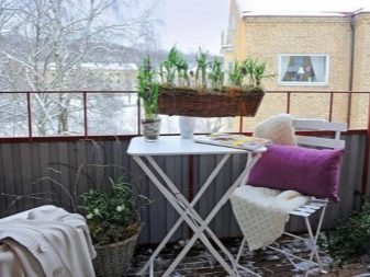 ستكون طاولة صغيرة قابلة للطي مناسبة في أي شرفة ؛ يمكن وضع الكراسي الناعمة بالقرب منها لقضاء وقت الفراغ في ظروف مريحة. في الجزء المقابل من غرفة الشرفة ، قم بتثبيت خزانة ملابس أو رف لإنشاء مكان لتخزين الأدوات المنزلية.