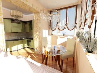 بالنسبة للمقطع الفسيح ، يمكنك تطوير مشروع تصميم كامل لغرفة الطعام ، حيث توجد مساحة لطاولة طعام كبيرة. تبدو طاولة الطعام مقتضبة في منطقة شرفة كبيرة مع نوافذ بانورامية ، ومع ذلك ، إذا كانت الشقة تحتوي ببساطة على لوجيا فسيحة ، فستكون مناسبة تمامًا لمواصلة المطبخ ومنطقة تناول الطعام.