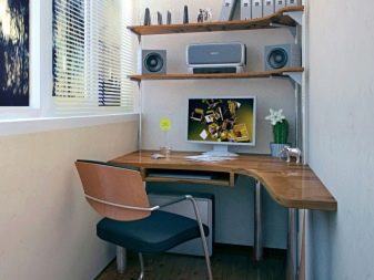 سيصبح مكتب الكمبيوتر مناسبًا في المكتب: حدده وفقًا لحجم الشرفة وضعه حيث لن تتداخل الطاولة مع سهولة الوصول. غالبًا ما يتم تثبيت مثل هذا الأثاث ، الزاوية أو المستطيلة ، في مكان مناسب من الغرفة ، ويتم تعليق الأرفف من الأعلى ويتم تثبيت الهياكل المعلقة اللازمة للعمل وتخزين الأشياء والمستندات والديكور.