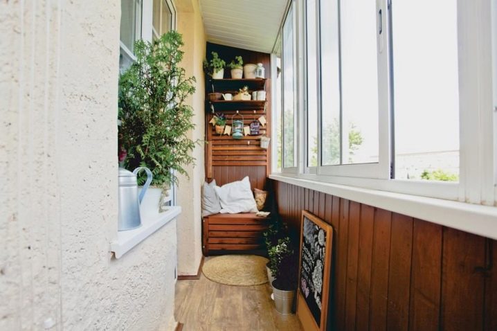 لتكسية جدران الشرفة ، يمكنك أيضًا استخدام الألواح الخشبية أو ألواح MDF. هذه مادة ميسورة التكلفة.. على الرغم من أن مظهره ريفي قليلاً ، إلا أنه يمكن تنويعه ببساطة عن طريق تغطيته بالورنيش أو اللامينيت..