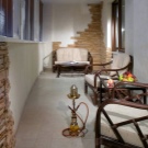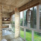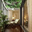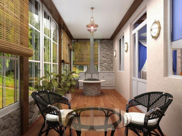 للحصول على مساحات أكثر اتساعًا ، يمكنك التوصل إلى العديد من حلول التصميم المثيرة للاهتمام. لذلك ، يمكنك تثبيت خزان اصطناعي أو طاولة ألعاب أو جهاز مشي أو أي جهاز آخر لممارسة الرياضة في الهواء الطلق. سيكون الخيار غير المعتاد هو تقسيم لوجيا كبيرة إلى مناطق وظيفية مختلفة. يمكنك إعداد طاولة كبيرة مع العثمانيين أو الكراسي بذراعين للاسترخاء مع الأصدقاء ، ويمكنك وضع أريكة سرير أو تعليق أرجوحة شبكية. ستبدو الأرجوحة شيقة للغاية مع كراسي من الخيزران وطاولة..