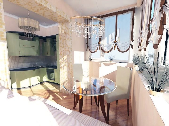 أيضا ، يمكن لوجيا توسيع مساحة المطبخ. في هذه الحالة ، سيكون مكانًا ممتازًا لتركيب طاولة بار أو طاولة حيث ستأكل وتشرب الشاي أو القهوة أثناء الاستمتاع بالمناظر من النافذة. في هذه الحالة ، سيساعد سطح الطاولة بين الغرفة واللوجيا في دمج المساحة والسماح باستخدامها بشكل أكثر عقلانية..