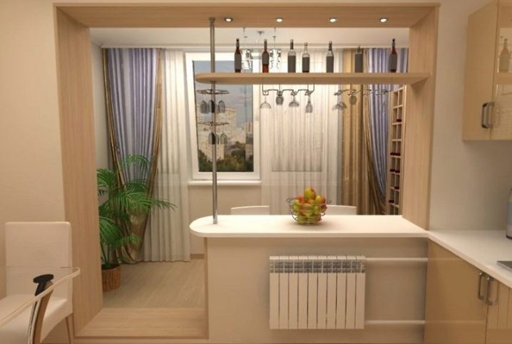 خيار ممتاز لنقل طاولة الطعام إلى المنطقة التي ظهرت حديثًا. غالبًا ما يتم ترتيبه من خلال الجمع بين الشرفة والمطبخ. من أجل عدم هدم الجدار الحامل ، والذي لن يُسمح لك به في BTI ، يتم عادةً تثبيت عداد قضبان بدلاً من النتوء ، والذي يحل محل طاولة الطعام. نتوء على السقف على شكل قوس. في الوقت نفسه ، تتناسب الثلاجة تمامًا مع مكان على الشرفة بالقرب من المنضدة. هذا مهم للغاية ، خاصة بالنسبة للشقق الصغيرة التي تبلغ مساحتها 6 أمتار مربعة. متر وشرفة بطول 3 متر. في منطقة غرفة الطعام هذه ، من الأفضل وضع صفح أو بلاط على الأرض..