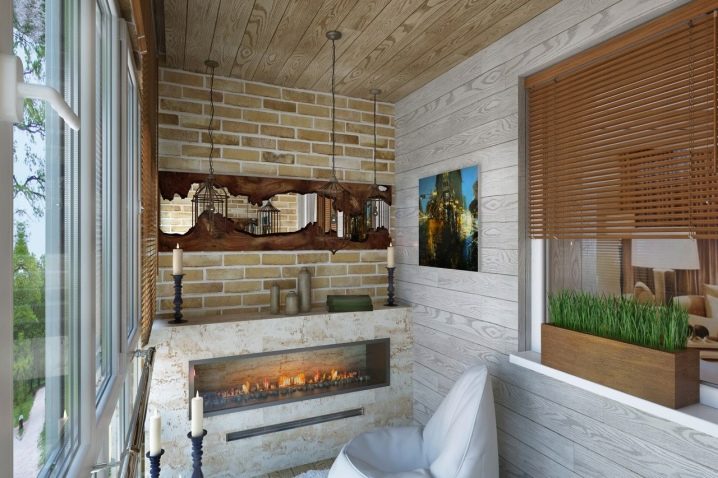 على الشرفة الواسعة ، يمكنك تنظيم غرفة معيشة صغيرة كاملة. لهذا ، من الممكن ترتيب مدفأة زائفة من اللوح الجصي ، وتثبيت منطقة جلوس والاستمتاع بأجواء السلام. لا يتطلب جهاز الموقد استخدام الحطب. يمكنك ببساطة تركيب موقد كهربائي أو تلفزيون فيه والاستمتاع بوهم الفحم المشتعل..
