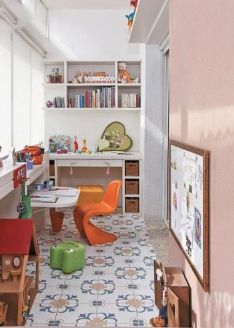 - في المباني الجديدة ، عادةً ما يصممون لوجيا واسعة ، حيث يمكنك أن تناسب غرفة ألعاب الأطفال بشكل مثالي مع الحد الأدنى من مجموعة كل ما تحتاجه ، خاصة وأن الأثاث الآن عملي للغاية.