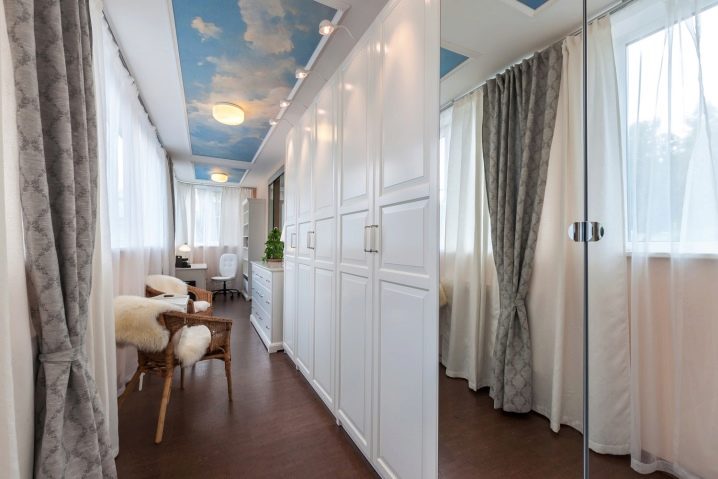 - في شقة صغيرة ، حيث يتم الوصول إلى الشرفة من غرفة النوم ، سيكون الخيار الممتاز هو تنظيم غرفة تبديل ملابس على الشرفة ، مع جميع الوظائف المخصصة لهذه الغرفة..