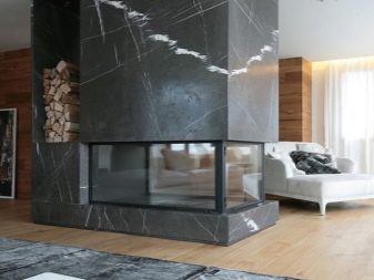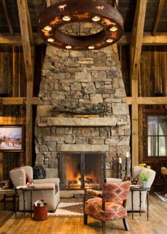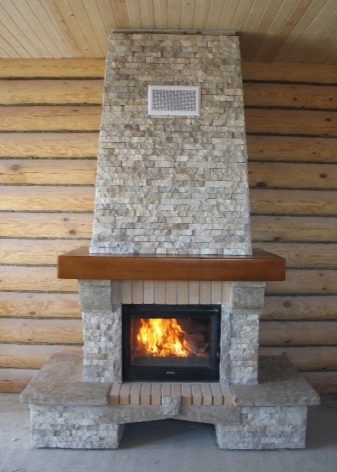 - سيتطلب الخيار الأول معظم المواد والحل ، لكنها ستغطي الغرفة بالحرارة قدر الإمكان ، ومن حولها يمكنك الجلوس في شركة كبيرة. غالبًا ما يكون رسم مثل هذا الموقد متماثلًا ، والواجهة على شكل حرف U ، وفي معظم الحالات تكون أعمال البناء بالطوب مطلوبة ، وتغطي المدخنة حتى السقف.
