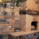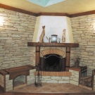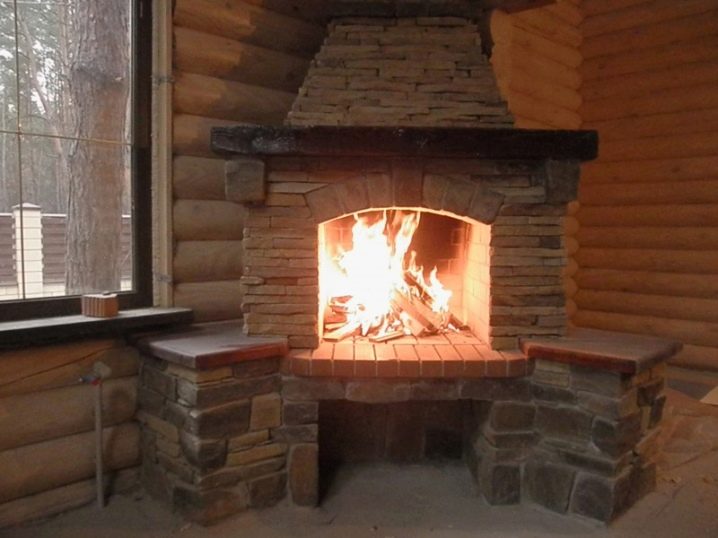 يجدر النظر في مثال جيد لموقد زاوية مبني من عدة أنواع من الحجر الطبيعي. الجزء السفلي مع استراحة للحطب مصنوع من أنقاض كبيرة بألوان داكنة مختلفة على ملاط أسمنتي. البوابة مع صندوق الاحتراق والمدخنة مبطنة بالحجر الجيري المسطح ذي اللون البيج اللطيف. بشكل عام ، تضفي هذه اللمسات النهائية على الموقد مظهرًا ريفيًا جميلًا يمكن دمجه تمامًا مع المناطق الداخلية لمنزل ريفي..