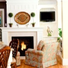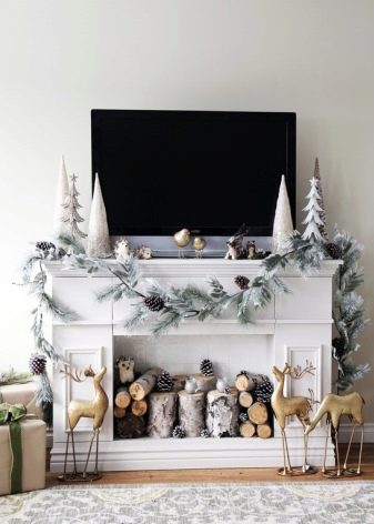 إذا رغبت في ذلك ، يمكنك تنفيذ الديكور المواضيعي للموقد. إذا كنت بحاجة إلى خلق جو العام الجديد ، فيمكنك تزيين الجزء العلوي من المدفأة بالأكاليل (الكهربائية والورقية). ولكن عند تزيين الموقد ، يجب إبعاد عناصر الديكور عن النار لتجنب نشوب حريق..