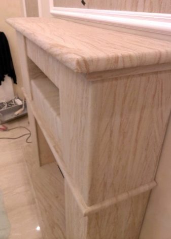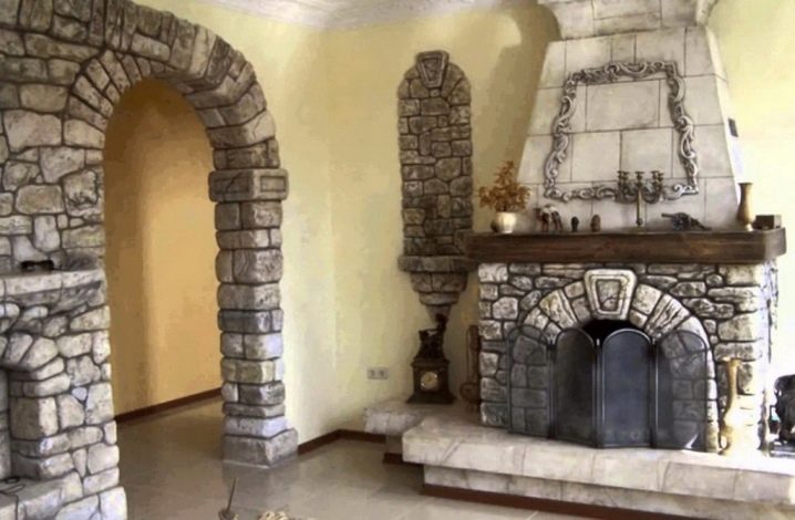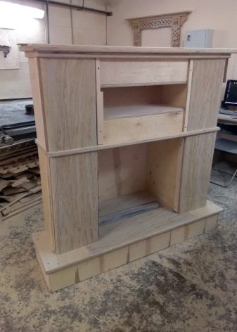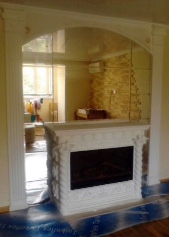 في هذه الحالة ، ستكون هناك حاجة إلى بناء قالب خاص. لهذا ، يمكنك استخدام دريوال أو نفس الخشب الرقائقي. أجزاء من الموقد مصنوعة من صندقة على الوجهين ، مما يترك مساحة فارغة بين الجانبين. تمتلئ هذه المساحة بالجص ، وبعد ذلك تُترك القوالب حتى تجف قاعدة الجص تمامًا. بعد التجفيف ، تتم إزالة القوالب ، ويتم تثبيت مكونات الزخرفة الزخرفية بالغراء المتصاعد أو المسامير.