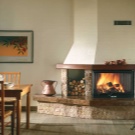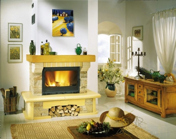 يمكن تركيب غطاء فوق المواقد الريفية. سيكون لها فقط وظيفة زخرفية. يشمل الطراز الريفي زاوية أو بوابة من الطوب مثبتة على الحائط. للكسوة ، يتم استخدام صخور الصدف أو الحجر الرملي.