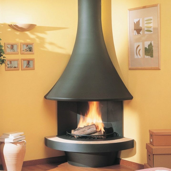 نوع آخر شائع من هذه المواقد هو الزاوية منها. توفر هذه النماذج مساحة كبيرة ، لذلك ، إذا كان لديك شقة أو غرفة صغيرة ، فمن المنطقي إلقاء نظرة فاحصة على مواقد الزاوية. يمكن أن تكون هذه المواقد ، مثل تلك المغلقة ، متماثلة أو غير متناظرة. عادة ما تكون مفتوحة من جانبين..