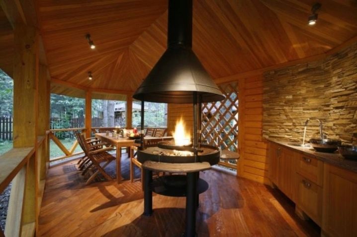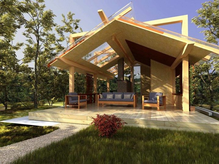 النوع الأول هو شرفة المراقبة المفتوحة أو الصيفية. مناسبة لأولئك الذين تم اختيارهم للداشا فقط خلال فترة الزراعة والحصاد ، والذين تسمح لهم الظروف الجوية. أبسط بناء للبناء. يمكن تركيب الموقد داخل وخارج الشجرة.