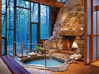 في الداخل ، انتبه بشكل خاص إلى الموقد. كومة خشبية مطوية بشكل جميل ، لعبة البوكر ، طاولة جزار ستكمل التصميم الداخلي بشكل رائع. أغطية الفراء المختلفة للكراسي والمصابيح الأنيقة والشمعدانات الرائعة وغيرها من العناصر الزخرفية ستضيف مزيدًا من الراحة إلى شرفة المراقبة.