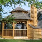 الطوب والخشب من المواد المتينة والمريحة. إنها مثالية لبناء شرفة مراقبة مفتوحة جزئيًا ومغلقة جزئيًا ومدفأة..