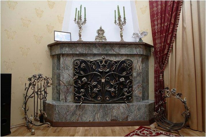 شبكات الديكور جيدة بنفس القدر لمدفأة مزيفة ولحقيقية. بالنسبة للموقد الخاطئ ، فهي مصنوعة من الأسلاك ومطلية باللون المناسب. في الموقد الحقيقي ، فإن المشابك مصنوعة من الحديد.