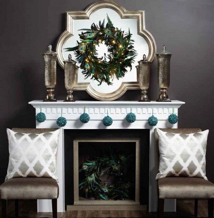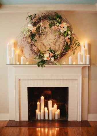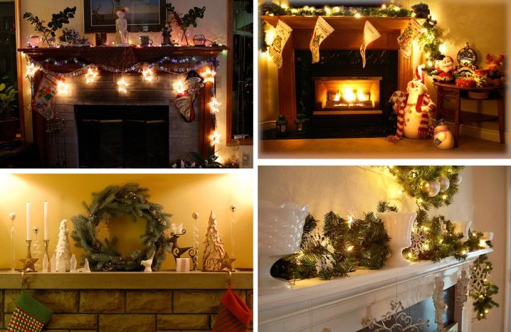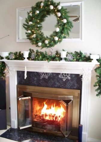 لتزيين الموقد لعيد الميلاد ، يتم استخدام الكفوف من الصنوبريات ، والتي تنتشر بطريقة فوضوية على رف الموقد. كما تصنع اكاليل الزهور منها. يتم توفير التألق والروعة للعطلة من خلال الألعاب المشرقة والزينة والأكاليل الكهربائية والشموع والفواكه الحمضية.