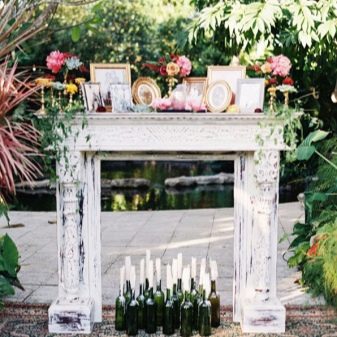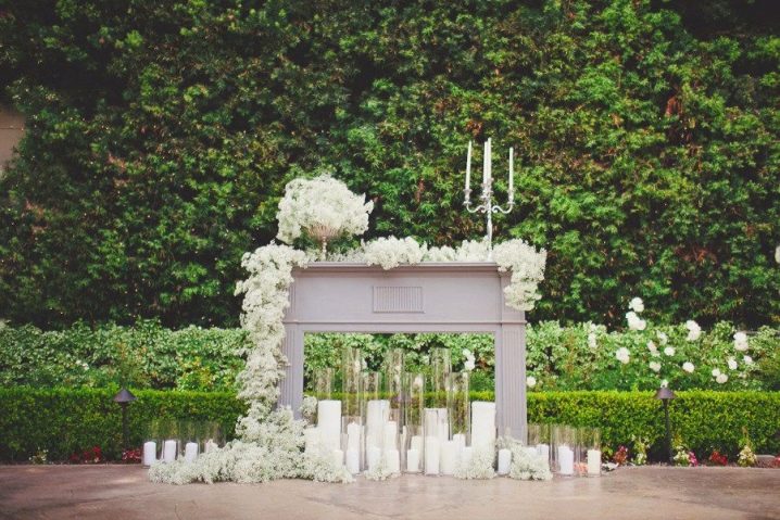 الزفاف هو حدث مهيب. الزهور والشموع والسمات البيضاء – كل هذا سيضيف الراحة ويظهر بشكل رائع. ستبدو الأزهار البيضاء الرقيقة وإكليلًا من القلوب الورقية رائعة على خلفية مدفأة حجرية كبيرة.