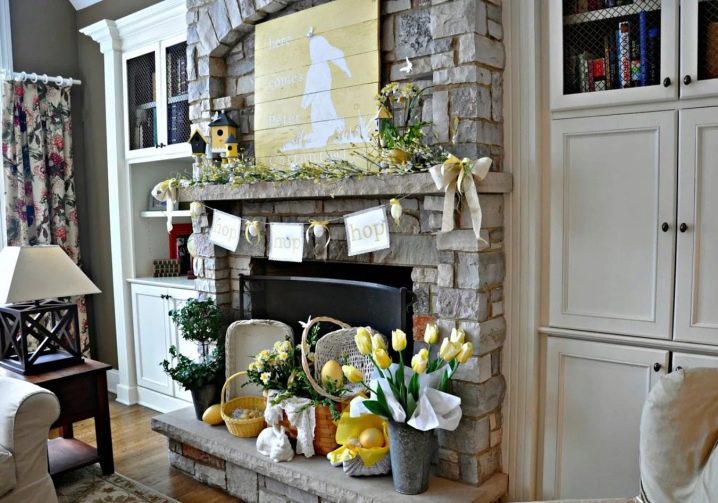 لتزيين مدفأة لعيد الفصح ، ستحتاج إلى خضار الربيع والفروع والبيض المطلي وأرانب عيد الفصح. يمكنك تعليق إكليل طويل من البيض الورقي أو قصاصات من القماش ذات الألوان الزاهية.