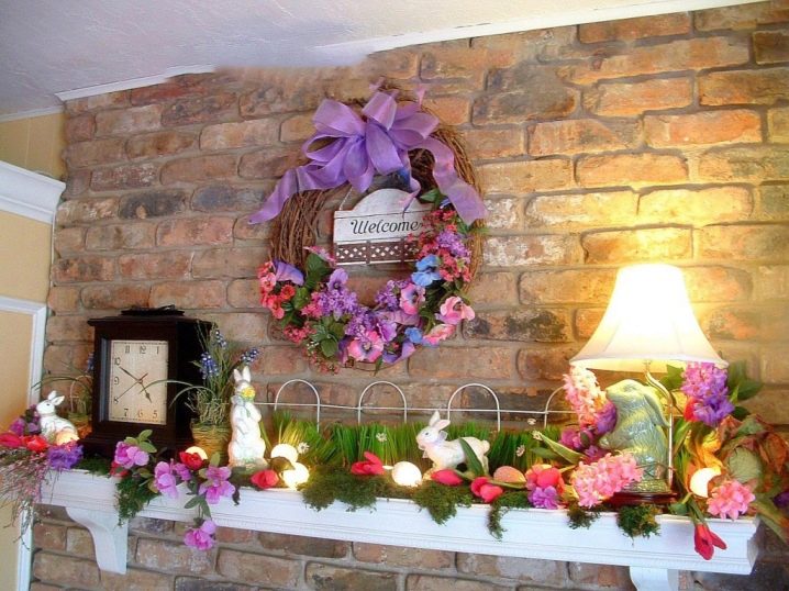 يمكن خلق جو احتفالي حتى في عيد الفصح. في هذا اليوم المشرق ، يكون للنار معنى خاص ، لأن الأسرة كلها تتجمع في الموقد. رف الموقد مثالي لتزيين العطلات. يمكنك وضع كل من كعك عيد الفصح التقليدي والبيض وأكاليل الزهور عليها..