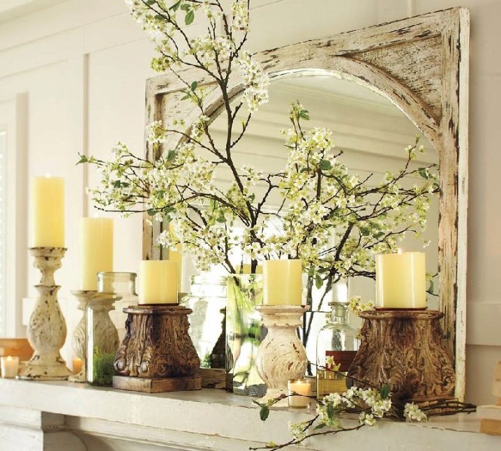 الربيع ليس وقت الحب فحسب ، بل هو أيضًا وقت للتحول والحياة الجديدة بشكل عام. لذلك ، في هذا الوقت ، تم تزيين الموقد وفقًا لموسم العام: الزهور الرقيقة والمساحات الخضراء. هنا يمكنك تجربة الزهور الطازجة: فهي مناسبة مثل الزنابق والبنفسج المحفوظ في أصص ، أو باقات من الورود والفاوانيا. أو يمكنك رسم أو قص التطبيقات على موضوع الربيع وتعليقها في إطارات فوق المدفأة.