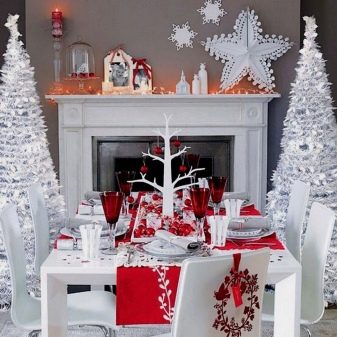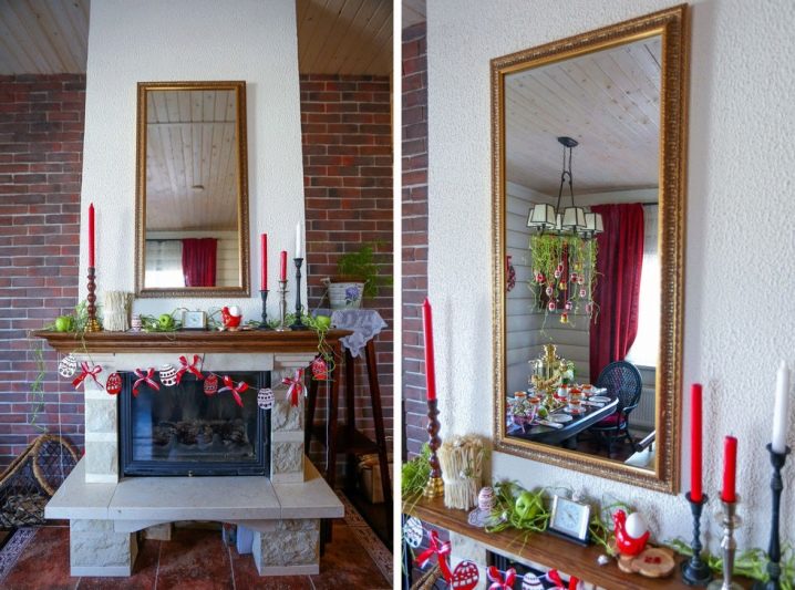 - الموقد مزين باللونين الأحمر والأبيض. الحد الأدنى من المجوهرات هو أقصى درجات الجمال. صور بإطارات جميلة ، رقاقات ثلج محلية الصنع ، شموع ، أكاليل – هذا كل ما تحتاجه لخلق أجواء العام الجديد بجوار المدفأة.