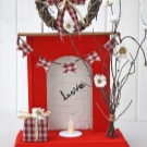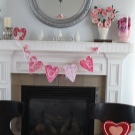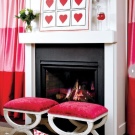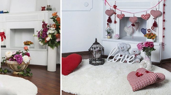 - تم تزيين الموقد المزخرف بأناقة بقلوب من القماش الممزوج عضويًا مع دمى الدببة والزهور الطازجة.