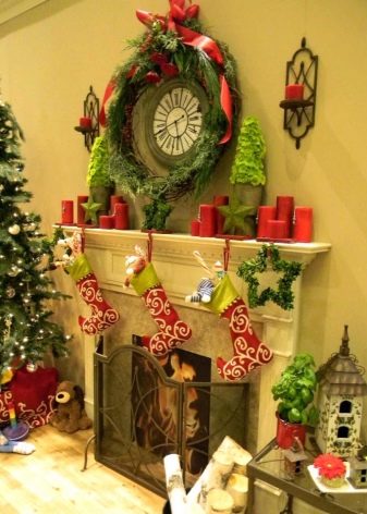 - الموقد مصمم بألوان تقليدية حمراء وخضراء. يتم الجمع بين الشموع الزخرفية والجوارب مع الهدايا بشكل رائع مع شجرة عيد الميلاد القريبة. تبدو الساعة الضخمة ، المزينة بإكليل من الفروع الحية ، أصلية للغاية.