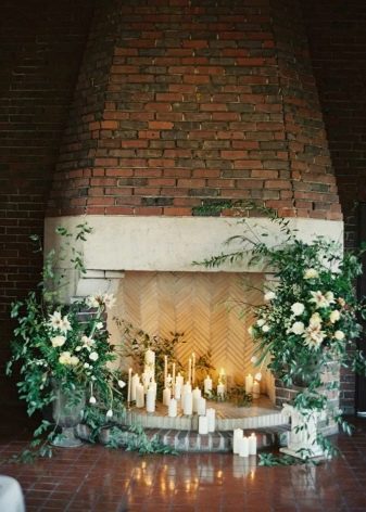 إليك مثال حي على بساطتها في تزيين مدفأة لحضور حفل زفاف: زهور نضرة وشموع بيضاء لطيفة وجميلة.